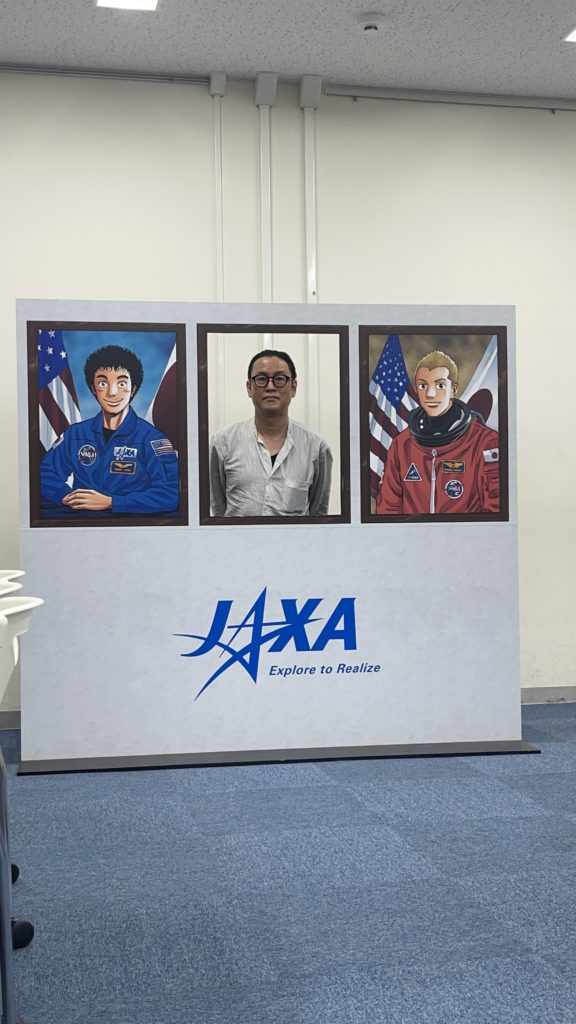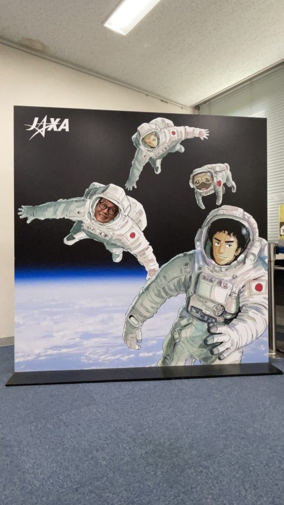 作品ファンとしては見逃せず、セルフタイマーで撮影。思わぬ形で宇宙兄弟の世界に入り込んだ瞬間でした。
